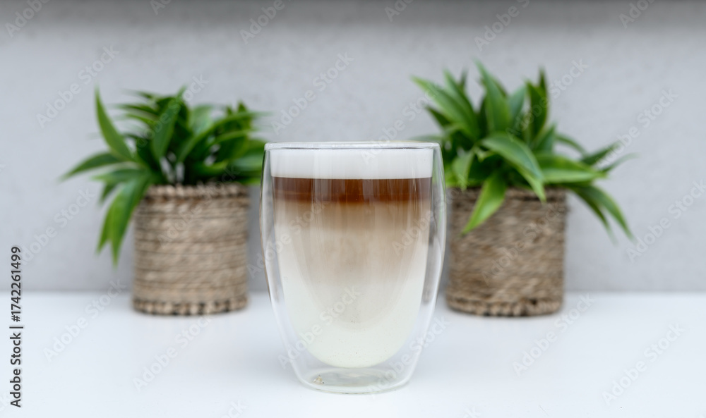 Latte macchiato in a thermal glass, showing layers of milk, coffee and creamy foam
