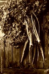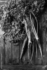 Bundle of raw organic purple carrot with green top haulm over old wooden plank background. Top view with space. Food background.