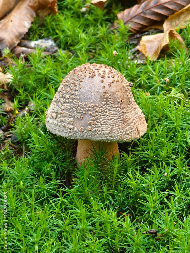 Spotted mushroom in autumn forest close-up view