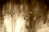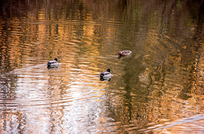 Ducks on a lake with a golden reflection on the water in Kyiv, Ukraine.