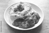 fried creamy egg omelet topping plain rice dressing potato and carrot in Japanese curry on plate