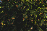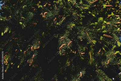 Fresh green saturated spruce branches fir with cones,needles.Deep shadow
