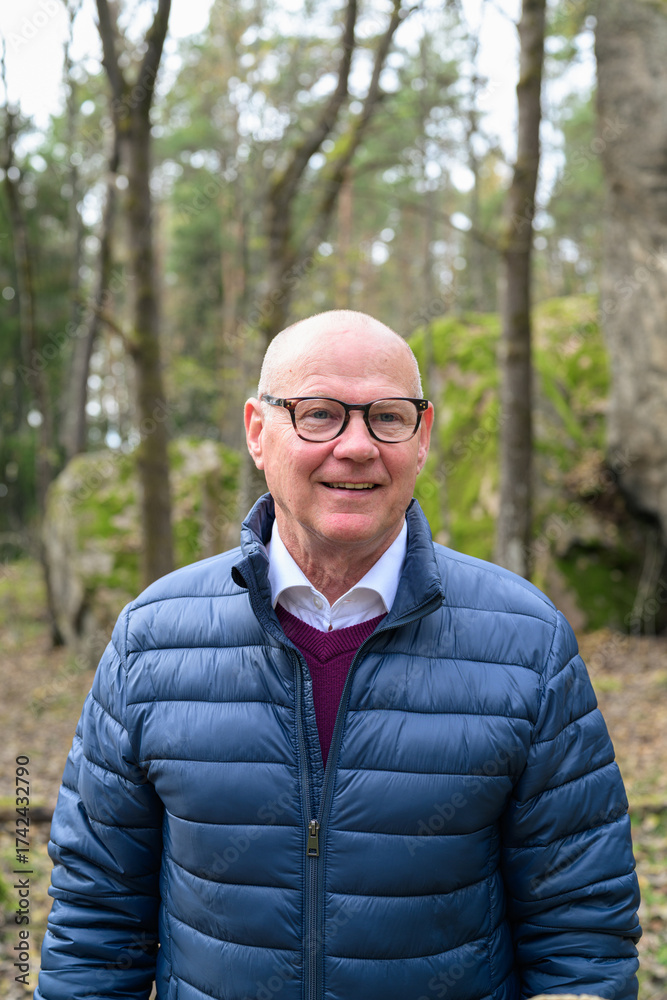 Portrait of a happy senior man smiling in the woods with eyeglasses