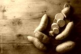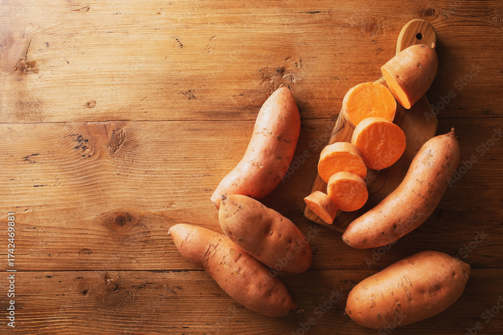 Raw sweet potatoes on wooden kitchen table top view. Organic and healthy food.