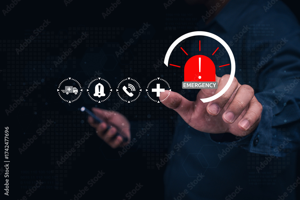 A person interacts with emergency icons on a digital interface, highlighting alerts and communication tools for urgent situations.