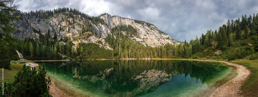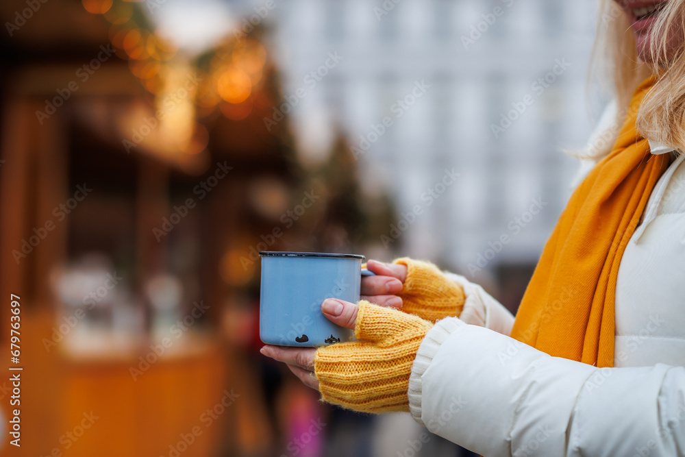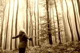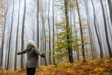 Forest bathing. Woman is feeling positive energy in foggy autumn woodland. Mental wellbeing and mindfulness outdoors