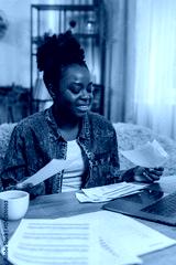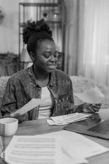 African American young woman sitting at table on home sofa nervously checks utility bills using laptop, printed papers. Black girl looks stressed overwhelmed trying to manage household payments online