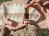 A small glass bottle of agarwood oil in female palms. Scented oil.
