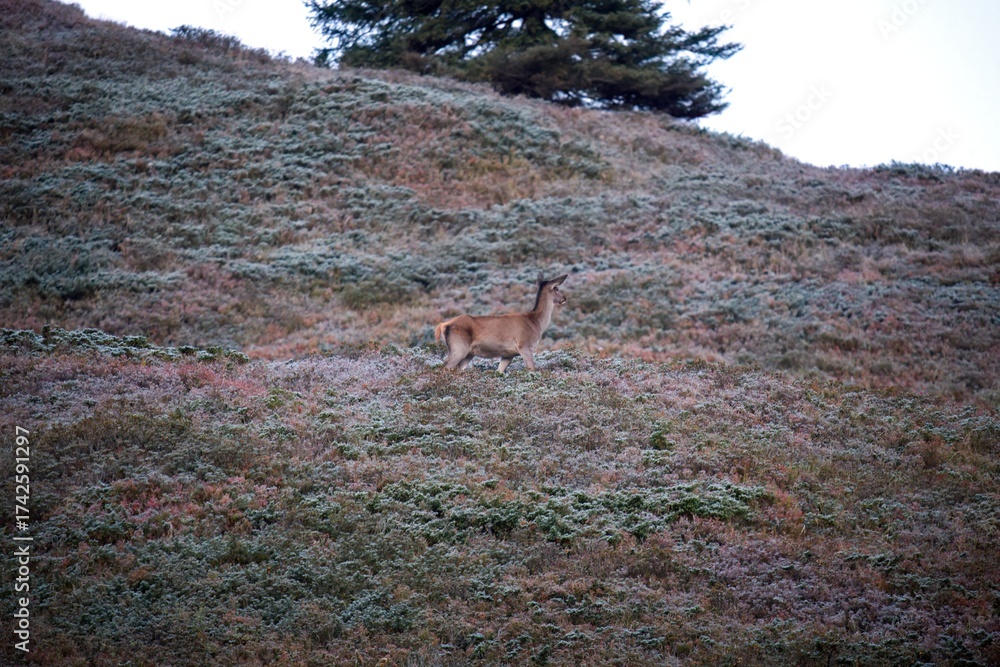 red deer female, cervus elaphus, in the mountains at a frosty autumn morning