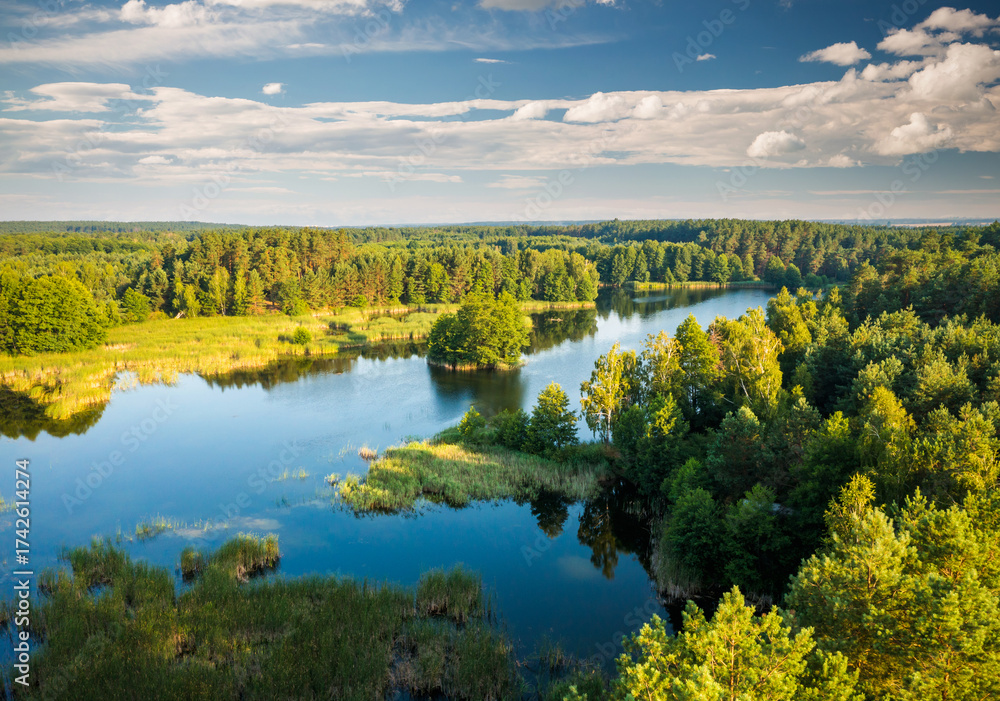 Spectacular bird's-eye view of the wetlands surrounded by coniferous forest and wild territory. Location Small Polissya, Ukraine, Europe. Drone shot. Photo wallpaper. Discovery the beauty of earth.