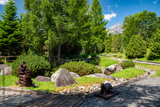 Botanic garden with trees and mountain peak in Tatranska Lomnica, High Tatras
