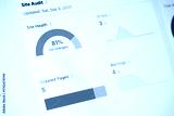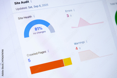 Digital screen displaying a detailed site audit report with site health at 81%, showing important errors, warnings, and crawled pages for website performance analysis