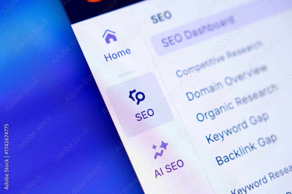 Digital screen displays an SEO dashboard, illustrating Home, Keyword Gap, Backlink Gap, and AI SEO for comprehensive website optimization strategy