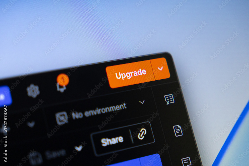 Digital interface displayed on a screen features an Upgrade button, notification icon, and Share option, representing software improvements and premium service subscription opportunities