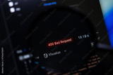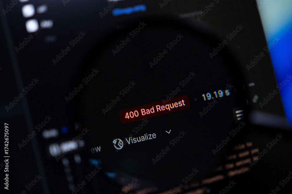 Magnifying glass highlights 400 Bad Request error on dark computer screen, symbolizing web development debugging, network issues, and IT system troubleshooting