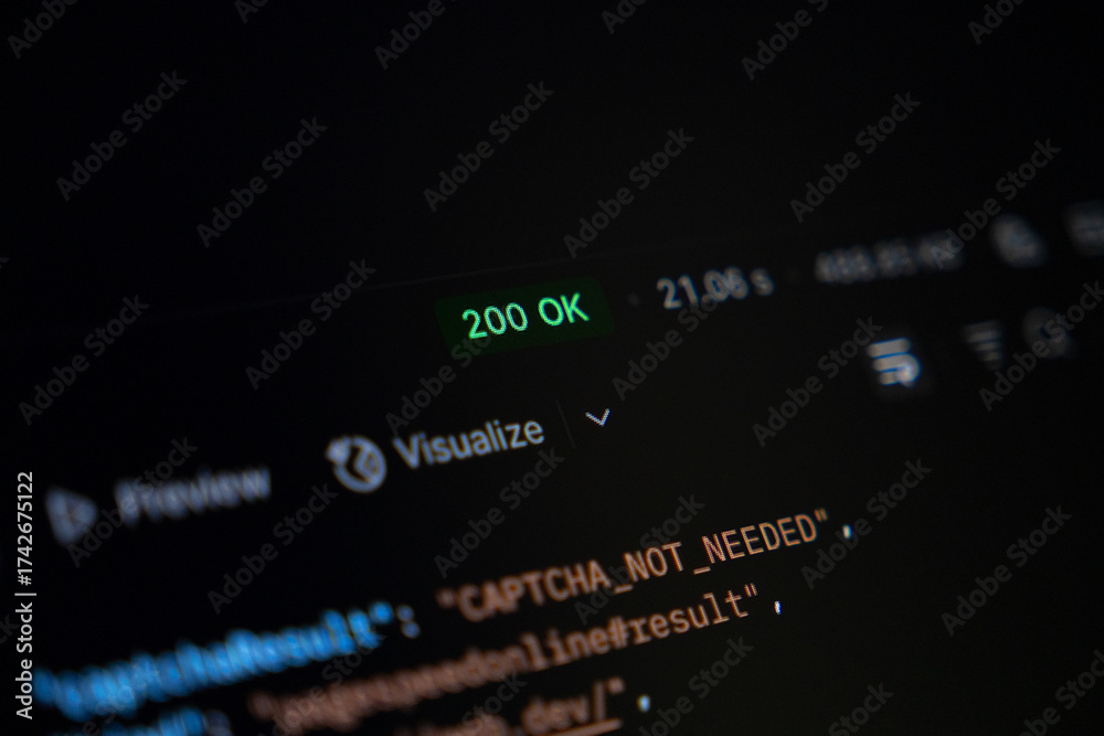 Abstract view of a dark computer screen interface showing a glowing 200 OK status, alongside programming code and data visualization options, reflecting successful digital operations