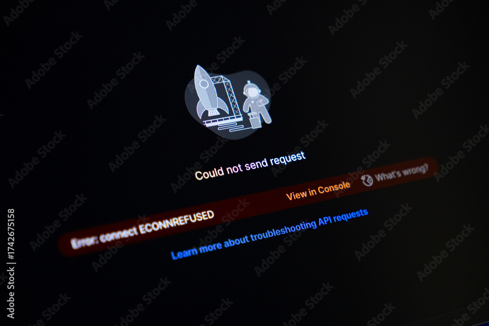 Screen displaying Could not send request and ECONNREFUSED error, highlighting a network connectivity failure for API requests in software development