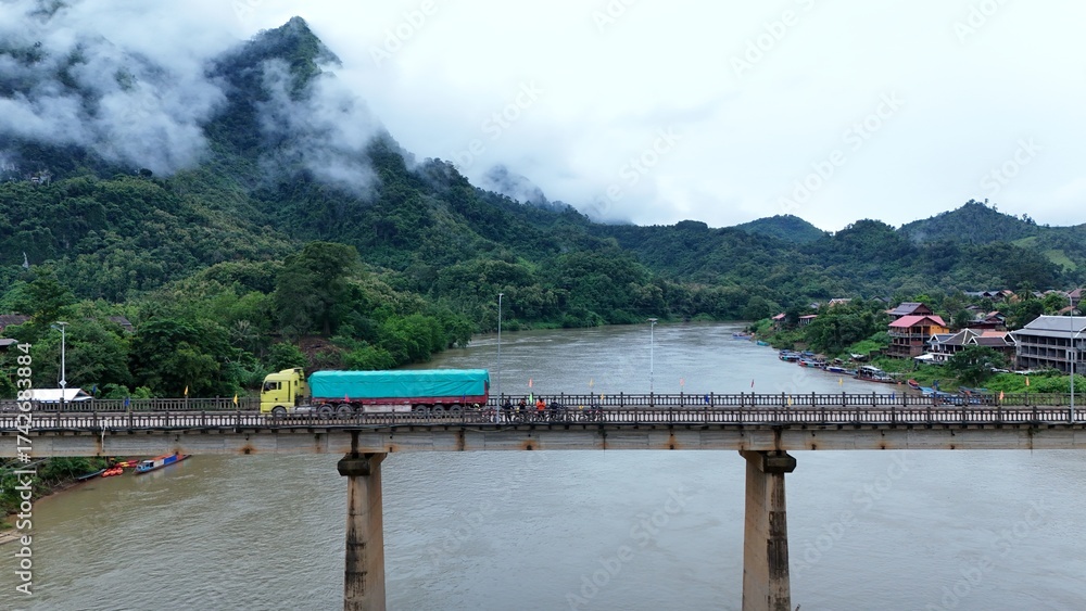 A truck crosses a bridge over a river surrounded by lush mountains and clouds, showcasing a scenic landscape.