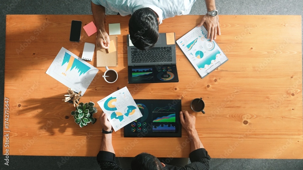 Male leader use laptop to analysis graph while marketing team working on tablet and looking at financial chart. Top view of startup group finding solution and planning strategy together. Convocation.