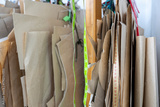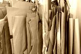 A close-up of a measuring tape hanging with paper sewing patterns in a tailor's workshop. A concept of precision, measurement, and the tools of the fashion design trade.