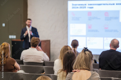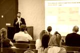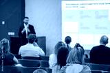 Presenter speaks to attentive audience in conference room with large screen displaying slides