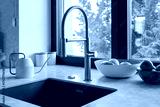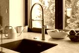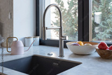 Modern kitchen sink with silver faucet near window and granite countertop. Interior of kitchen with detail.