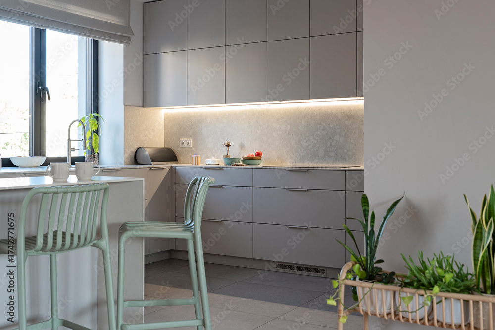 Modern kitchen in interior of house with grey furniture with drawers and cabinet. Kitchen sink by the window and mint chair. New apartment.
