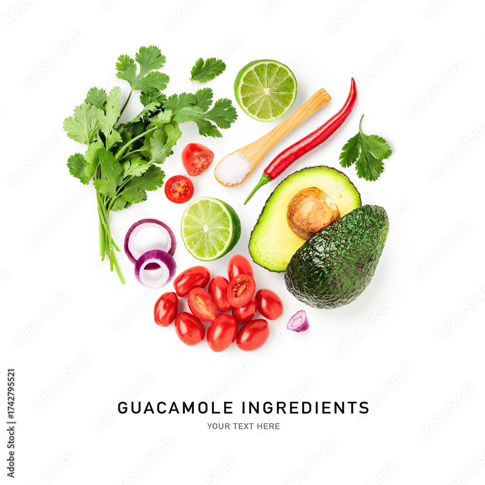 Fresh guacamole ingredients flat lay with avocado, lime, chili, tomatoes, coriander, and red onion. Mexican cuisine concept. Healthy food, isolated on white background, top view.