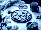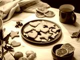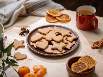 Wooden platter with baked gingerbread shapes is surrounded by seasonal spices, oranges, and a mug of tea.