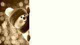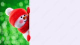 Playful wool‑felt snowman pops in from the right beside a blank banner, red hat and mittens glowing on a soft green bokeh backdrop. 3d render illustration.