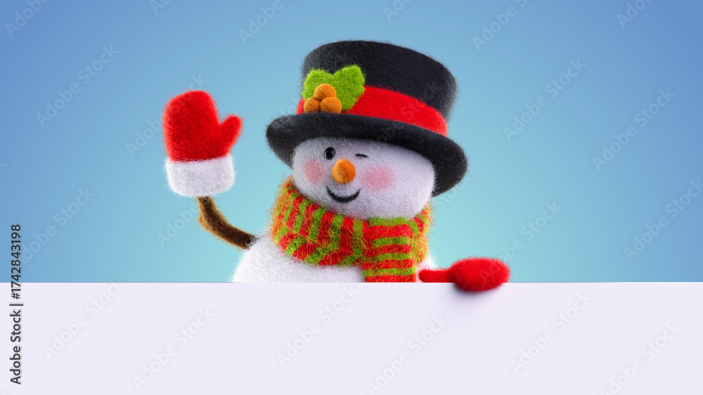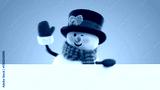 Wool‑felt snowman pops in from the left, waves a red mitten, and smiles behind a white banner in a clean studio clip.