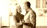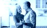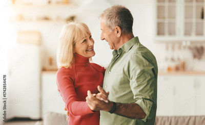 Love In Older Age. Loving Senior Couple Dancing At Home, Smiling To Each Other And Holding Hands Having Date. Happy Marriage, Romance And Long-Lasting Relationship Concept