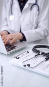 Stethoscope is lying on the glass table while doctor woman is working with laptop computer on the background, close-up. Medicine and pharmacy concept