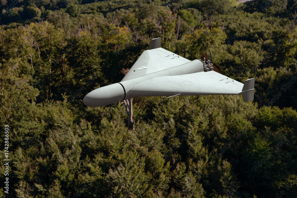 A modern military unmanned drone flies over a dense forest, carrying out a combat mission.