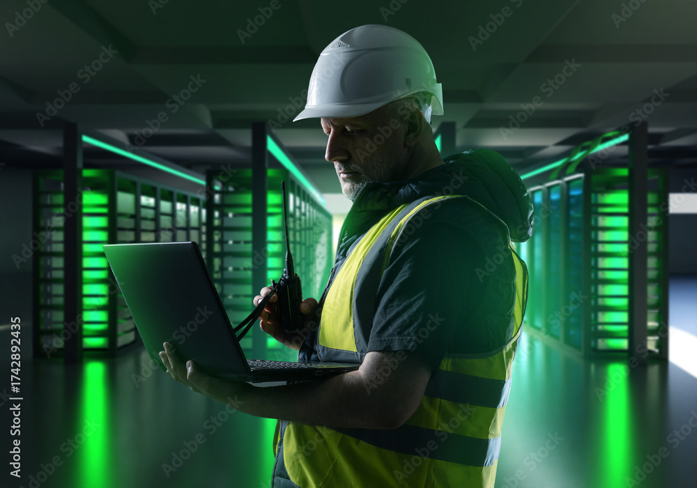 Engineer in safety vest and hard hat using laptop and radio inside modern data center with glowing green server racks. Data center, IT infrastructure.