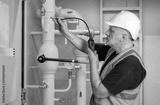 Worker in helmet and safety vest checking gas pipeline with detector, industrial inspection, safety control, engineering, maintenance, energy industry.