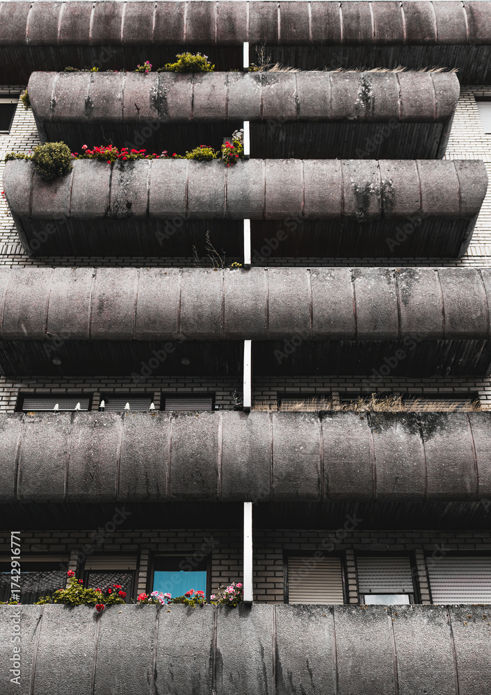 Symmetrical view of an old residential building with textured concrete balconies and small flower pots adding color to the weathered architecture, creating a contrast between decay and life