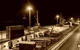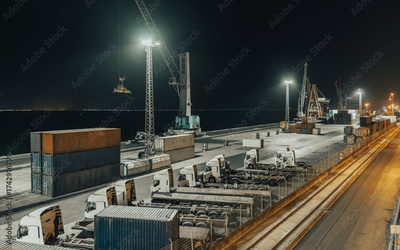 Industrial night scene at a seaport terminal with cargo trucks, shipping containers, and large cranes under bright artificial lighting, highlighting global logistics and freight transport operations