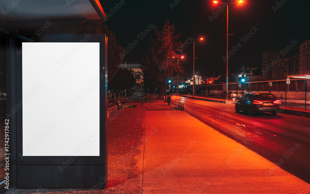 Blank illuminated billboard mock-up at a modern bus stop at night, with blurred car lights from long exposure, glowing street lamps, and vibrant urban reflections; with a copy space area on the right