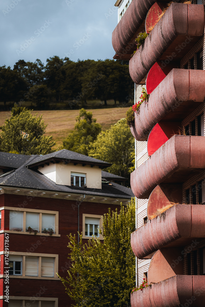 Vertical telephoto view of red and concrete curved balconies with plants, contrasted against nearby residential buildings and green hills, combining urban architecture with nature