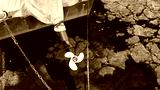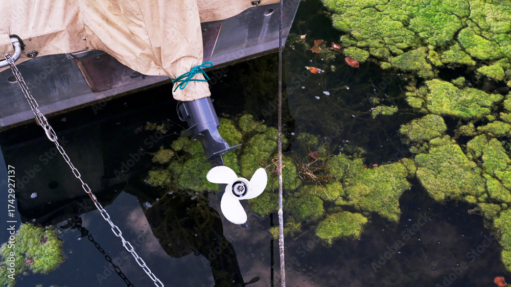 Boat motor propeller above green algae in calm water on a quiet afternoon