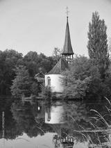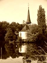 Charming lakeside chapel surrounded by trees on a clear day in a serene natural setting