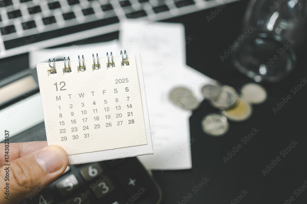 Monthly Expenses and Financial Struggles in 2025 DECEMBER. desk calendar DEC 2025 held in hand. low income, and money not being enough to cover bills. budgeting, debt, and economic hardship.