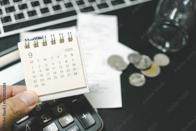 Monthly Expenses and Financial Struggles in 2025 SEPTEMBER. desk calendar SEP 2025 held in hand. low income, and money not being enough to cover bills. budgeting, debt, and economic hardship.
