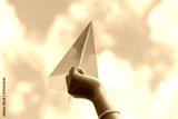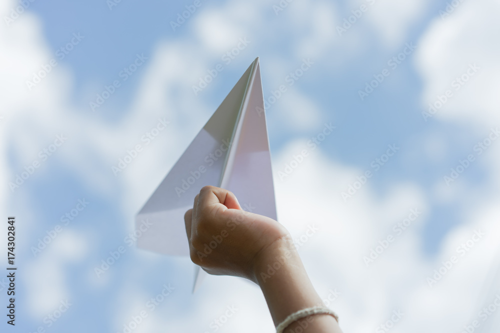plane paper in children hand and blue sky in cloudy day. business concept.