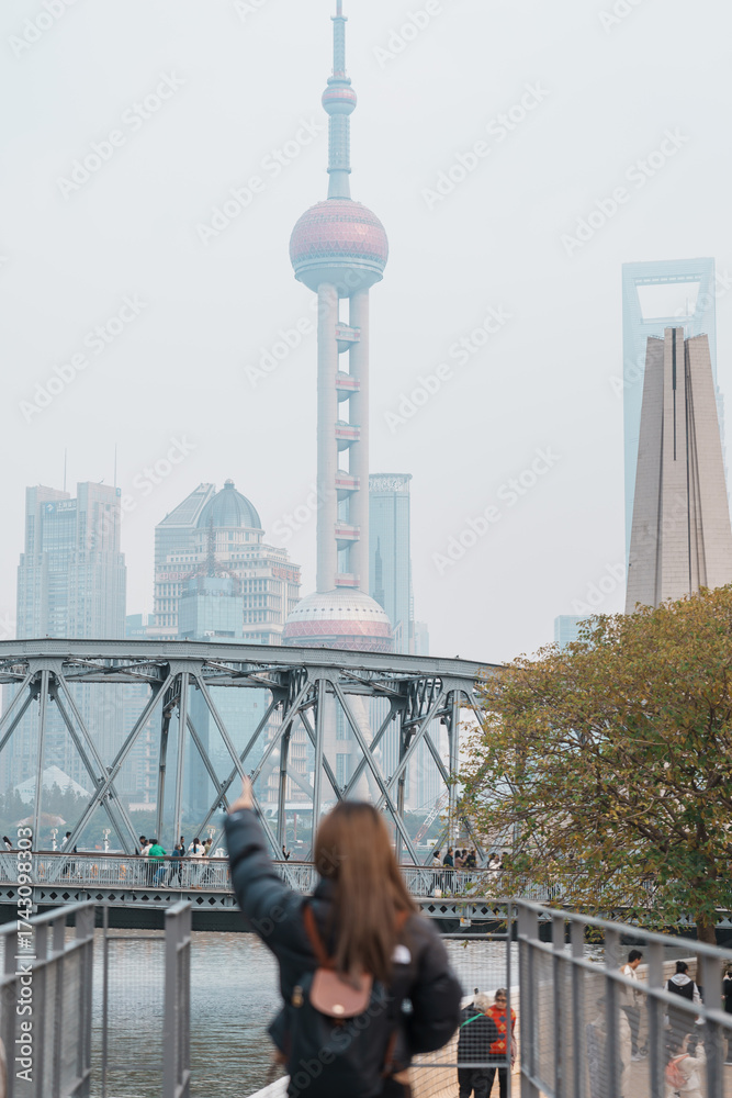woman traveler visiting in Shanghai, China. Happy Female Tourist sightseeing Oriental Pearl Tower and Waibaidu Bridge view. landmark and popular for tourism attractions. Travel and vacation concept
