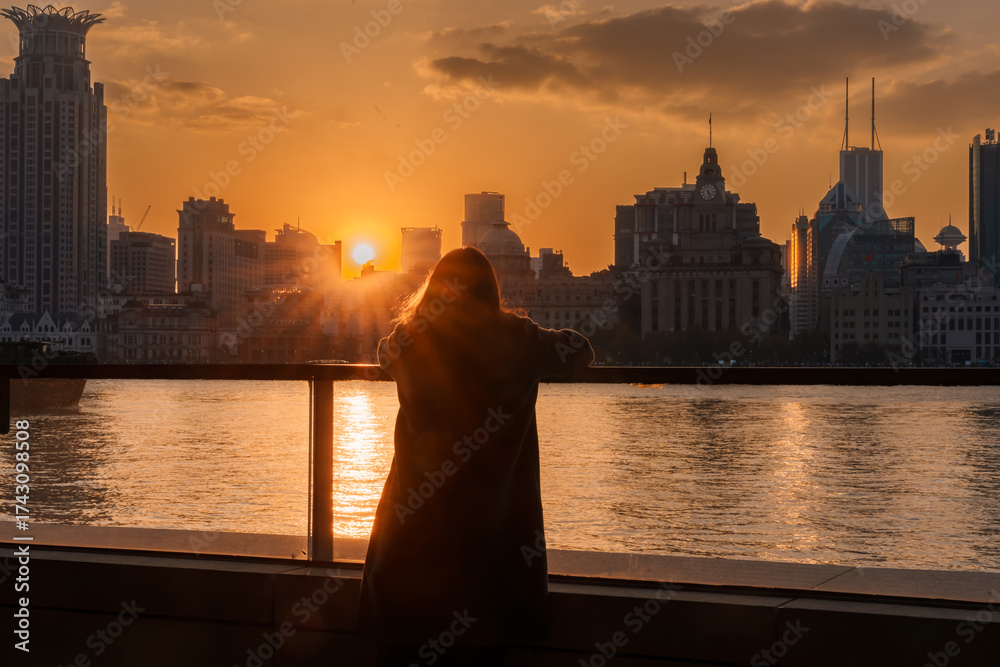 woman traveler visiting in Shanghai, China. Happy Female Tourist sightseeing Shanghai view of the bund in Lujiazui at sunset. landmark and popular for tourism attractions. Travel and Vacation concept