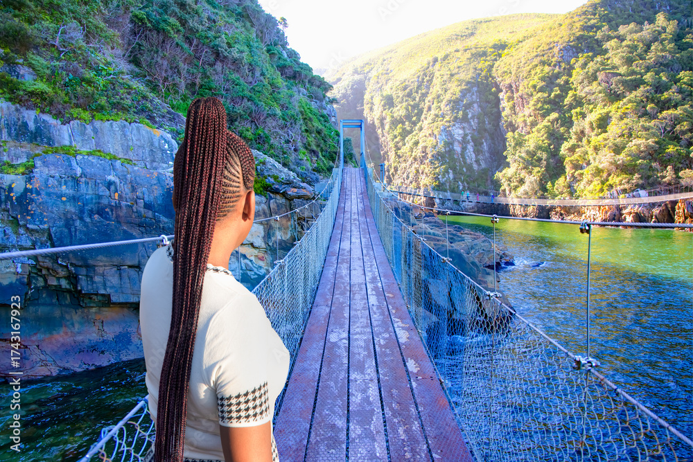 A beautiful young South African girl with braided hair watches the bridge - The suspension bridge over the storms river mouth within Tsitsikamma National Park - Eastern Cape in South Africa