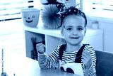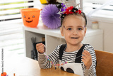 Happy child creating halloween bead craft with costume. DIY ideas for Halloween.