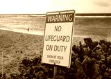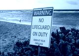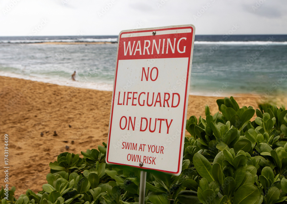 A sign stating No Lifeguard on Duty at a beach with stormy conditions. A person is in the water in the background.